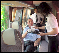 6 cars équipés de climatisation, téléviseurs TNT, lecteur de DVD, CD, GPS, micros sans fil, frigo-bar, toilettes, micro-onde